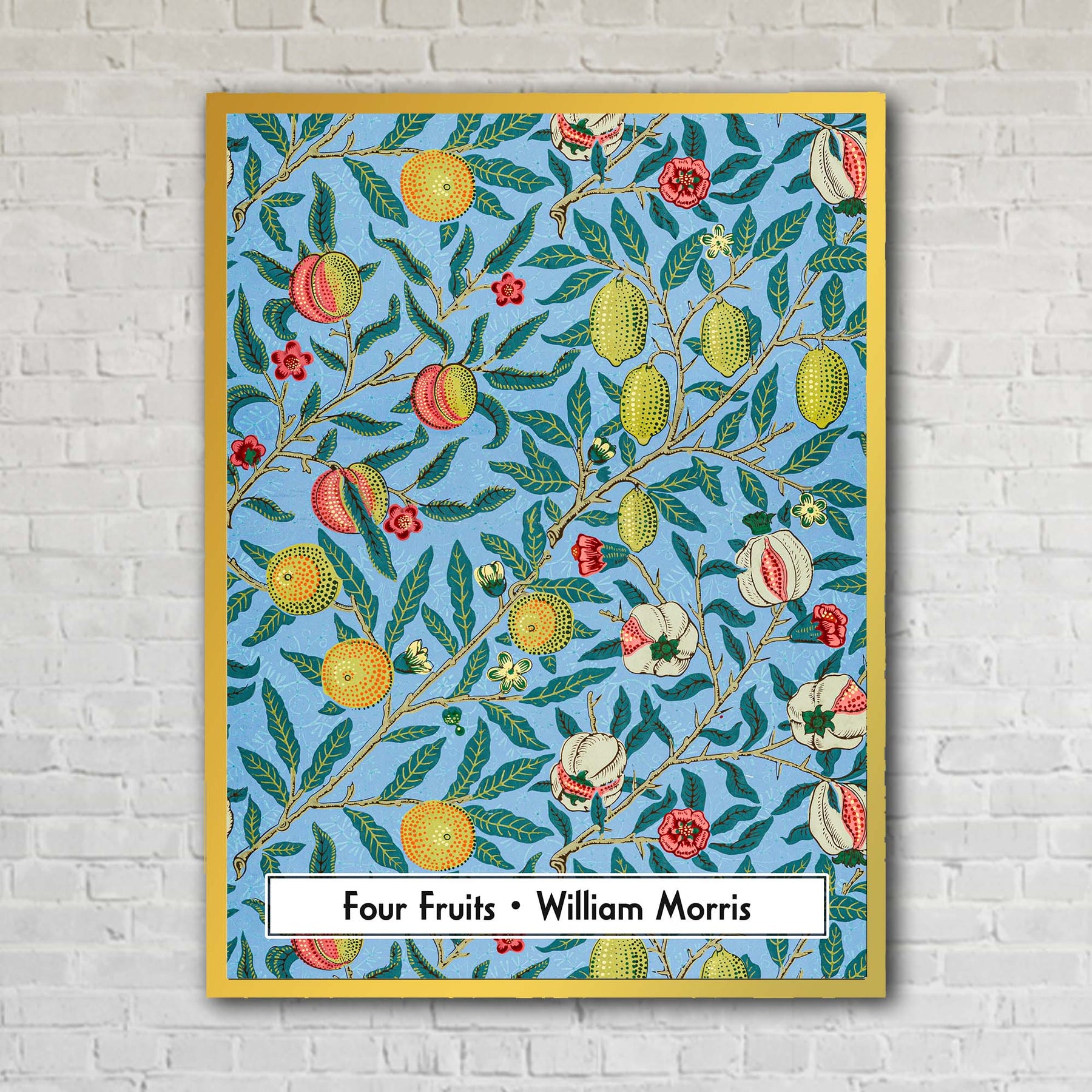 William Morris's Four fruits (1862) famous textile pattern. Four Fruits showcases a burst of beautiful fruits including pomegranates and limes underpinned by a serene blue background. The elaborate composition of the flowering and ripe fruit hanging from entwining branches combine to create a charming, idyllic design.