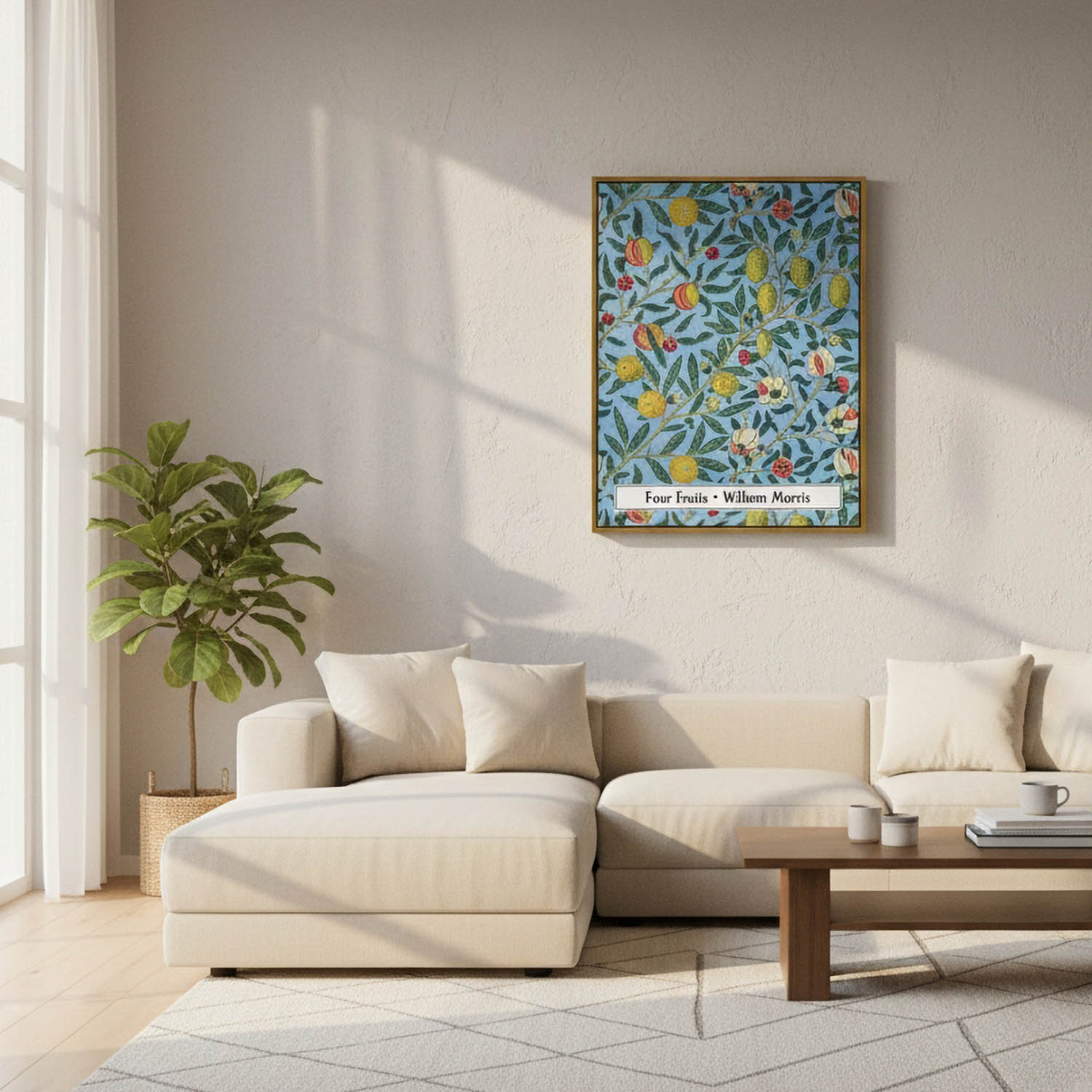 William Morris's Four fruits (1862) famous textile pattern. Four Fruits showcases a burst of beautiful fruits including pomegranates and limes underpinned by a serene blue background. The elaborate composition of the flowering and ripe fruit hanging from entwining branches combine to create a charming, idyllic design.